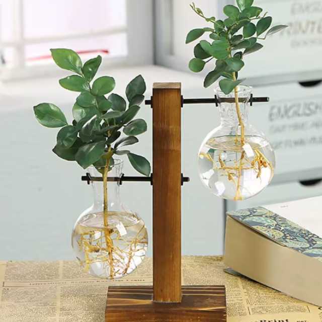 Vase Suspendu Nature – Support en Bois & Fioles en Verre